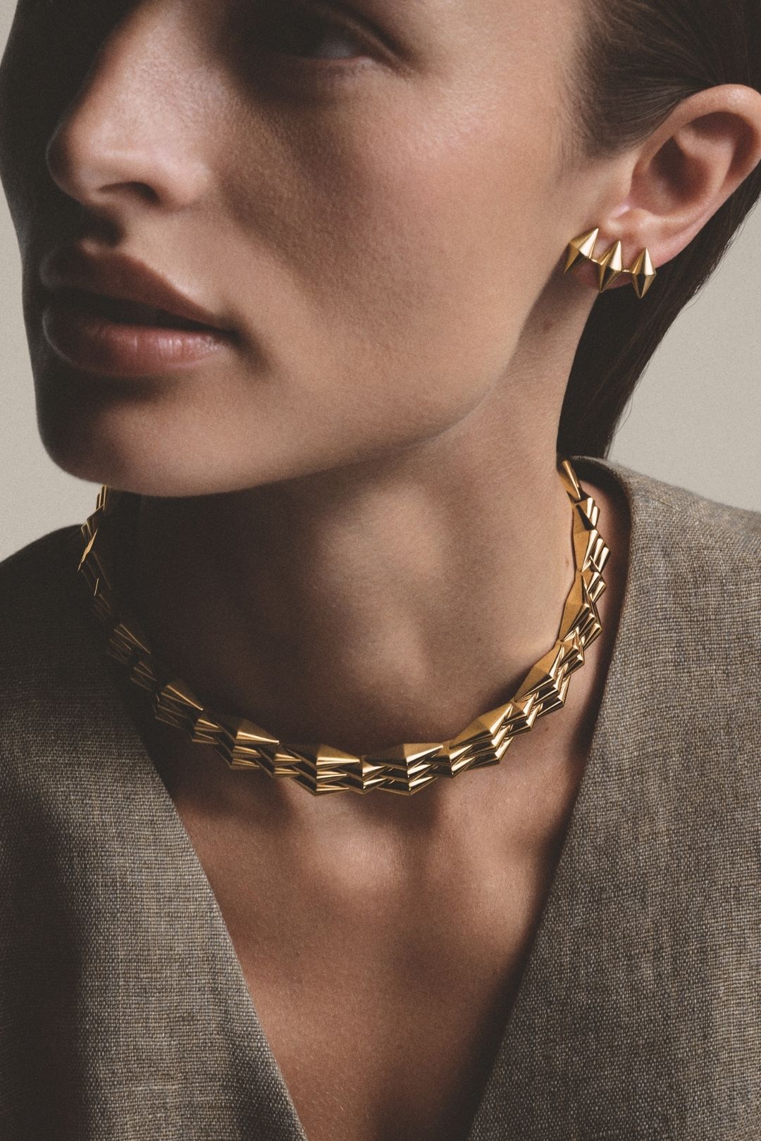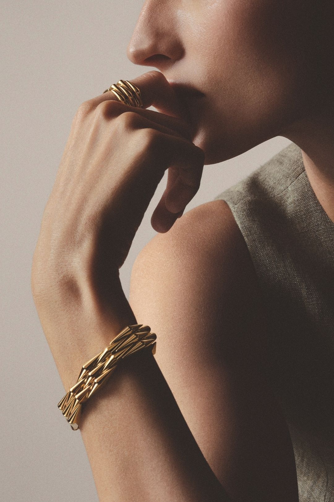 Verticality takes centre stage in the earrings. Articulated and elongated, they channel the warmth of yellow gold with unmistakable Italian flair. Alongside them, a singular ear-cuff distils the daring spirit of Vimini into a sharp, contemporary accent.